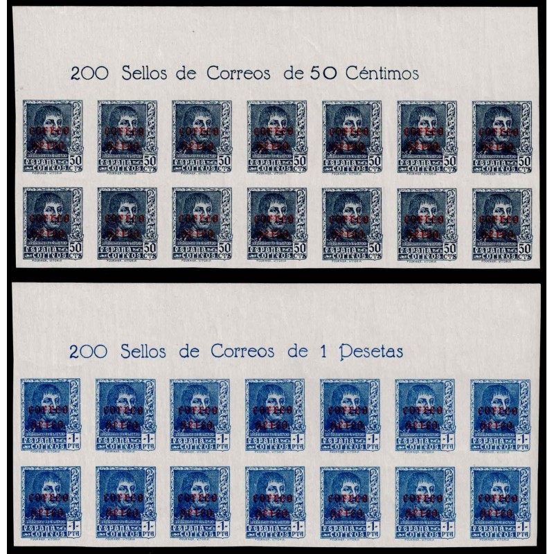 Fernando el Católico Correo aéreo. Magnífica serie completa sin dentar en bloques de 14 presenta amplios márgenes y borde de hoja superior con Leyendas "200 Sellos de Correos de (50 Céntimos ó 1 Pesetas)". Preciosa pieza. Gran lujo. Certificado C.E.M.