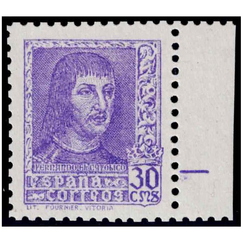 Fernando el Católico. Rarísima variedad en color violeta del 30 Céntimos rojo dentado y con goma original presenta borde de hoja lateral derecho y magnífico centraje. No catalogado. Lujo.