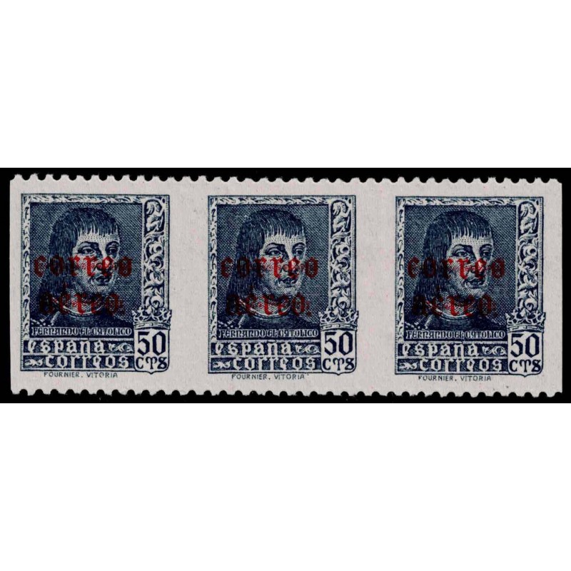 Fernando el Católico Correo aéreo. Muy rara tira de 3 horizontal del 50 Céntimos pizarra con variedad de perforación sin dentado vertical presenta magnífico centraje y buenos márgenes. No catalogada sin señal de fijasellos.