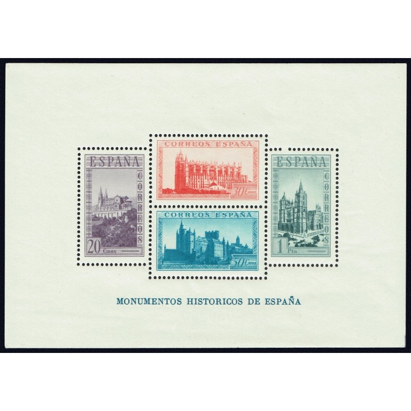 Monumentos históricos. Hojita bloque con señal de fijasellos en calidad habitual FILATELIA HOBBY, muy similar a la mostrada en esta imagen genérica.