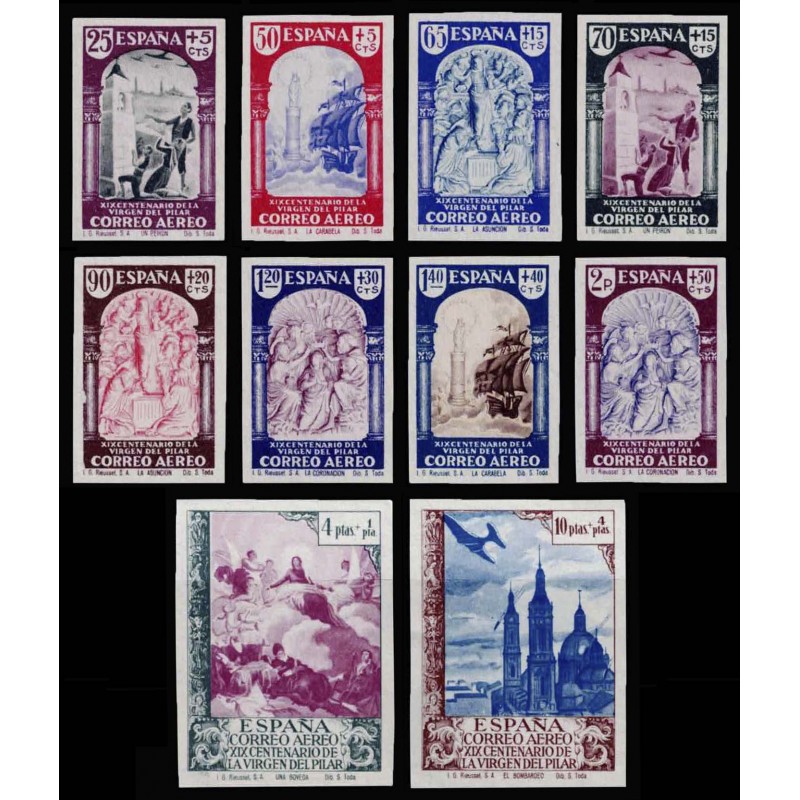 XIX Centenario de la venida de la Virgen del Pilar a Zaragoza. Correo aéreo. Rara serie completa sin dentar y sin goma presenta amplios márgenes. Tirada de 1.000 ejemplares.