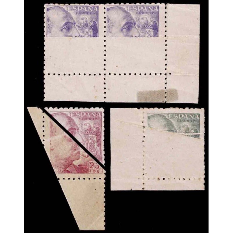 General Franco y escudo de España. Raro conjunto de variedades de impresión parcial en los valores 20 Céntimos violeta, 25 Céntimos carmín-lila y 40 Céntimos verde-grisáceo con señal de fijasellos.