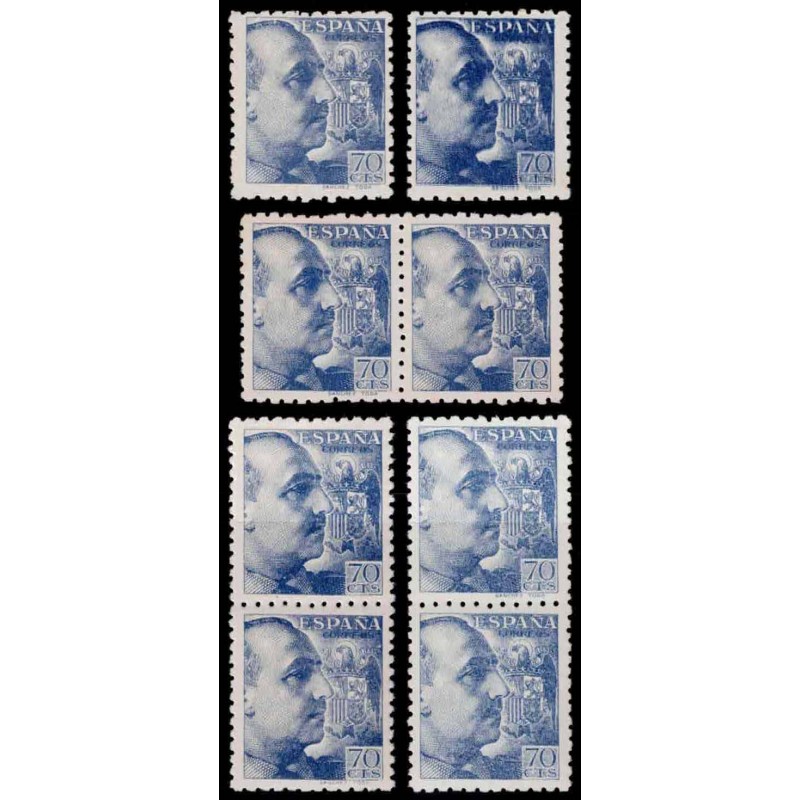 General Franco y escudo de España. Precioso conjunto de 70 Céntimos ultramar con variedad de impresión doble y variedades en el pie de imprenta "SÁNCHEZ TODA" individual y en tres parejas con distintas posiciones.