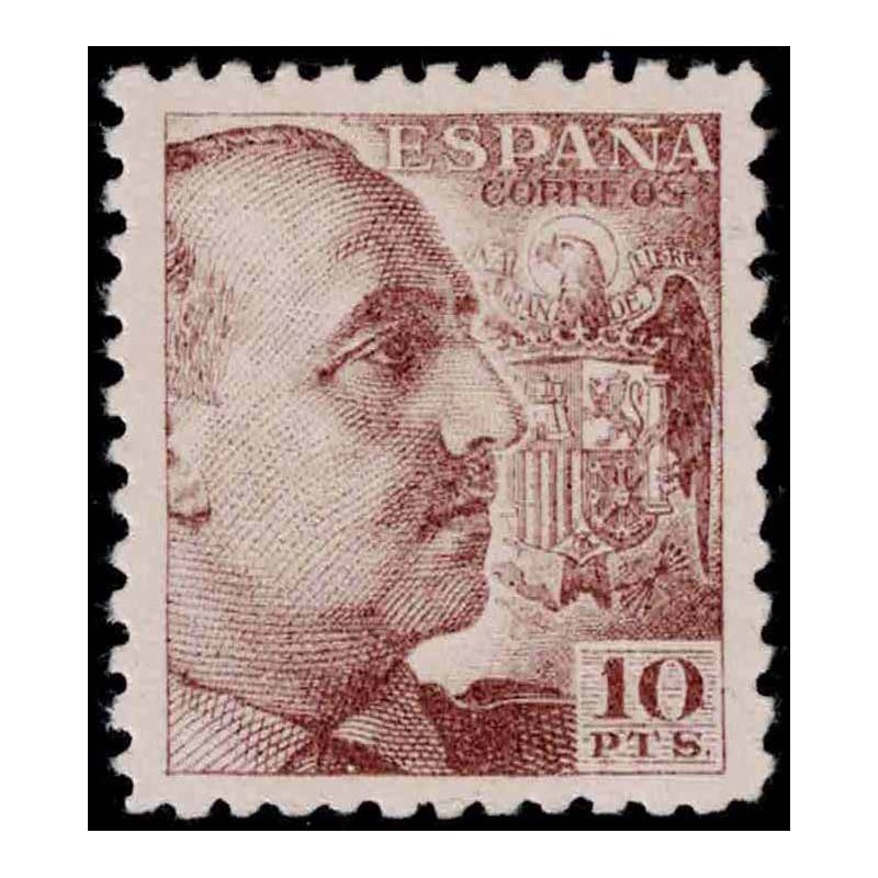 General Franco y escudo de España. Precioso 10 Pesetas castaño valor clave de la serie variedad de perforación con dentado 10 presenta excelente centraje. No catalogado sin señal de fijasellos.