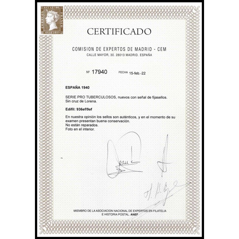 Pro Tuberculosos 1940. Rara serie completa error de impresión por falta de la Cruz de Lorena con señal de fijasellos. Certificado C.E.M.