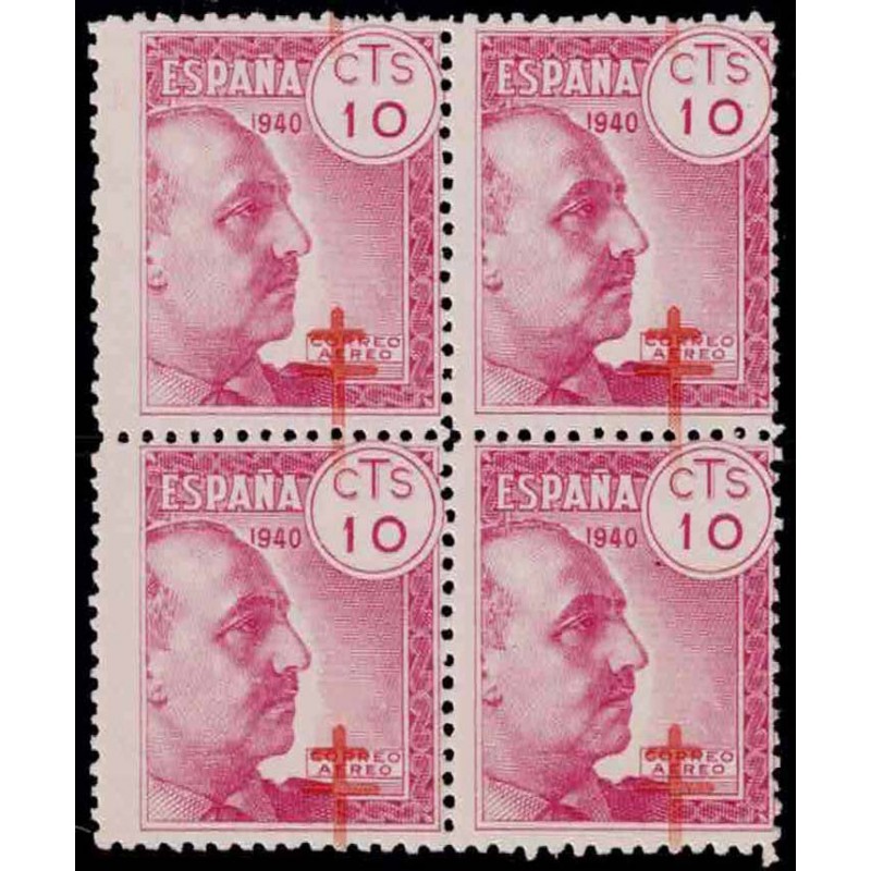 Pro Tuberculosos 1940. Bonito bloque de 4 del 10 Céntimos rosa con error de impresión Cruz de Lorena desplazada hacia abajo. No catalogado sin señal de fijasellos.