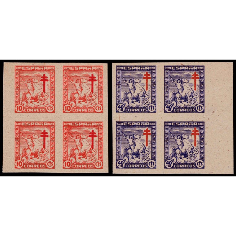 Pro Tuberculosos 1944. Muy raro conjunto de variedades de papel cartulina gris sin dentar en bloque de 4 con borde hoja lateral del 10 Céntimos naranja y el 40 + 10 Céntimos violeta presenta amplios márgenes. Lujo.