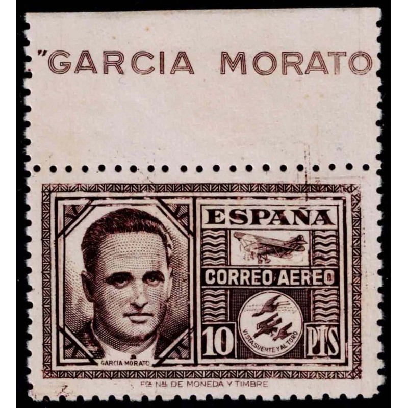 Carlos Haya González y Joaquín García Morato. Correo aéreo. Raro cambio de color castaño-negruzco del 10 Pesetas carmín con borde de hoja superior y leyenda "GARCIA MORATO" presenta excelente centraje. Lujo.