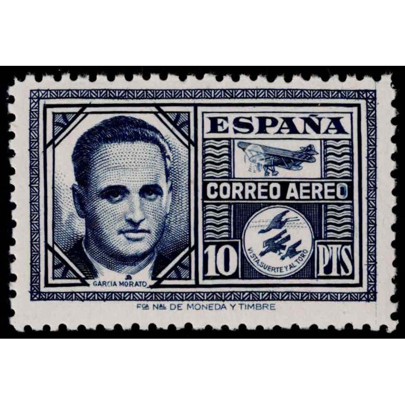 Carlos Haya González y Joaquín García Morato. Correo aéreo. Raro cambio de color azul-oscuro del 10 Pesetas carmín presenta excelente centraje.