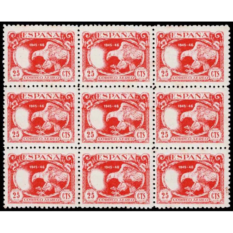Pro Tuberculosos 1945. Correo aéreo. Rarísimo bloque de 9 del 25 Céntimos rojo con error de impresión sin la Cruz de Lorena presenta excelente centraje.
