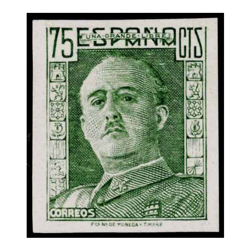 General Franco, de frente. Precioso cambio de color verde-amarillento sin dentar del 75 Céntimos azul presenta amplios márgenes. No catalogado sin señal de fijasellos.