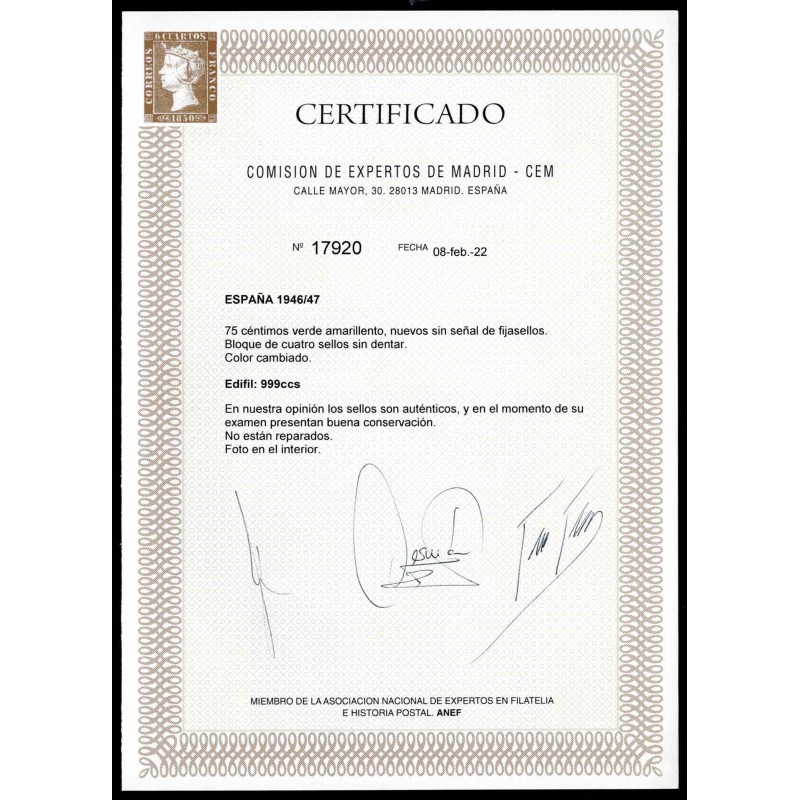 General Franco, de frente. Muy raro bloque de 4 cambio de color verde-amarillento sin dentar del 75 Céntimos azul con esquina de pliego superior derecha presenta amplios márgenes. No catalogado sin señal de fijasellos. Gran lujo. Certificado C.E.M.