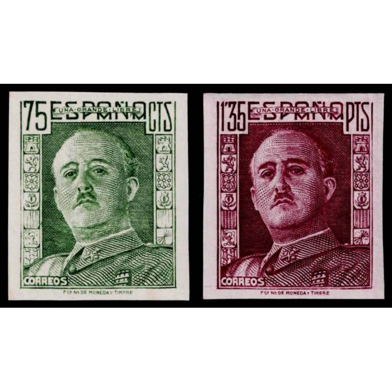 General Franco, de frente. Raro conjunto de cambios de color verde y magenta sin dentar del 75 Céntimos azul y 1,35 Pesetas violeta presenta amplios márgenes. No catalogados sin señal de fijasellos. Lujo.