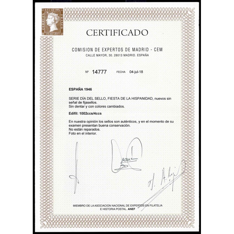 Fiesta de la Hispanidad. Día del sello. Rarísima serie muy completa de colores cambiados sin dentar, incluyendo el 5,50 Pesetas carmín-lila sin dentar no catalogado presenta amplios márgenes. Lujo. Certificado C.E.M.