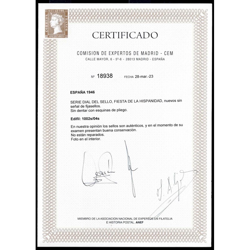 Fiesta de la Hispanidad. Día del sello. Preciosa serie completa sin dentar con esquina de pliego superior derecha y numeración presenta amplios márgenes. Gran lujo. Certificado C.E.M.