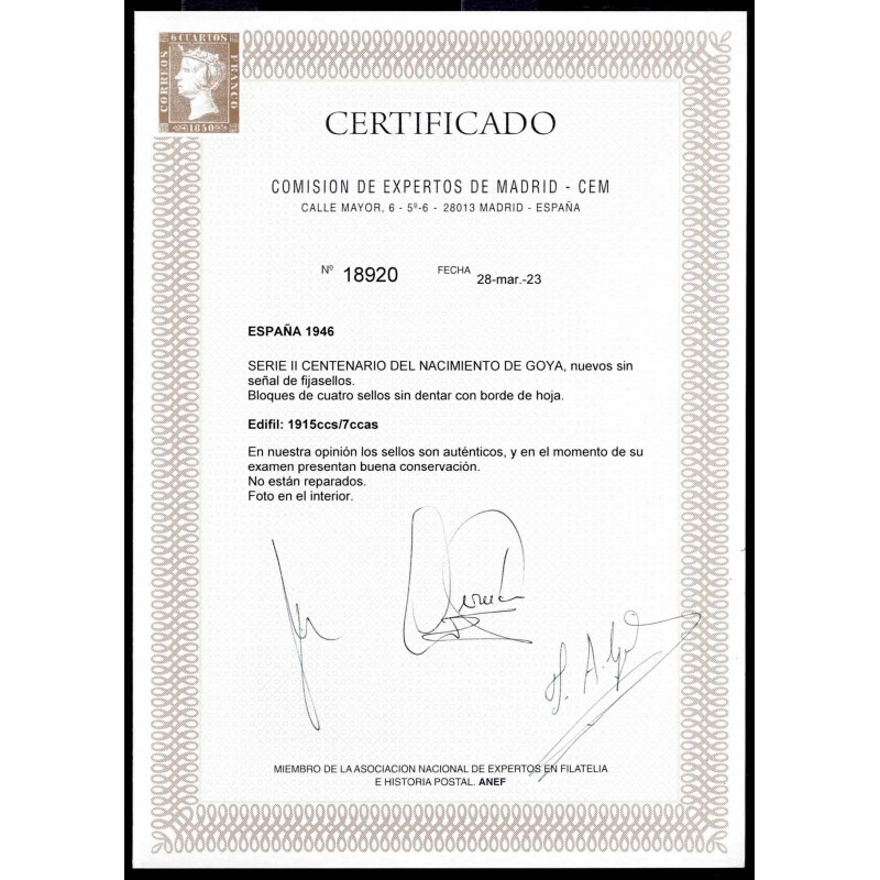 II Centenario del nacimiento de Goya. Rarísima serie completa sin dentar en bloque de 4 de cambios de color rosa-carminado, amarillo y violeta con esquina de pliego superior derecha y numeración presenta amplios márgenes. No catalogada sin señal de fijasellos. Gran lujo. Certificado C.E.M.