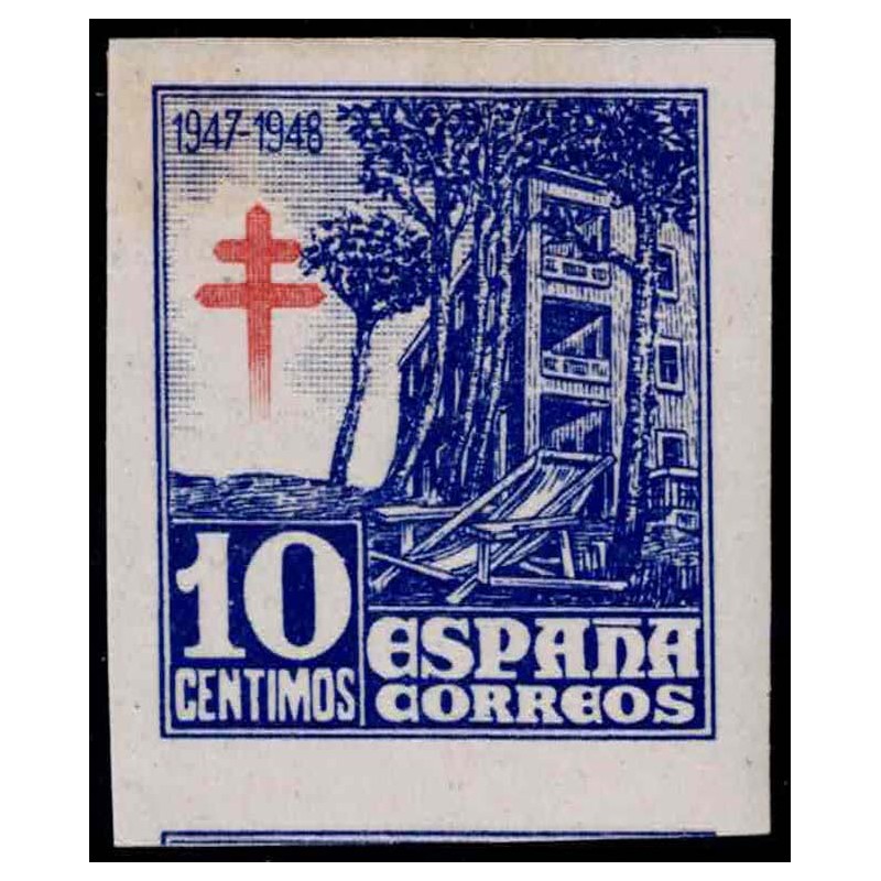 Pro Tuberculosos 1947. Correo aéreo. Muy raro 10 Céntimos violeta-azulado sin dentar con señal de fijasellos presenta amplios márgenes.