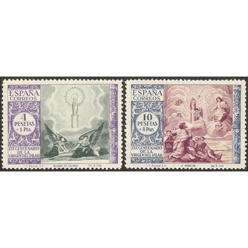 XIX Centenario de la venida de la Virgen del Pilar a Zaragoza. Preciosa serie completa muestra de colores cambiados con numeración 000,000. No catalogada sin señal de fijasellos. Lujo.