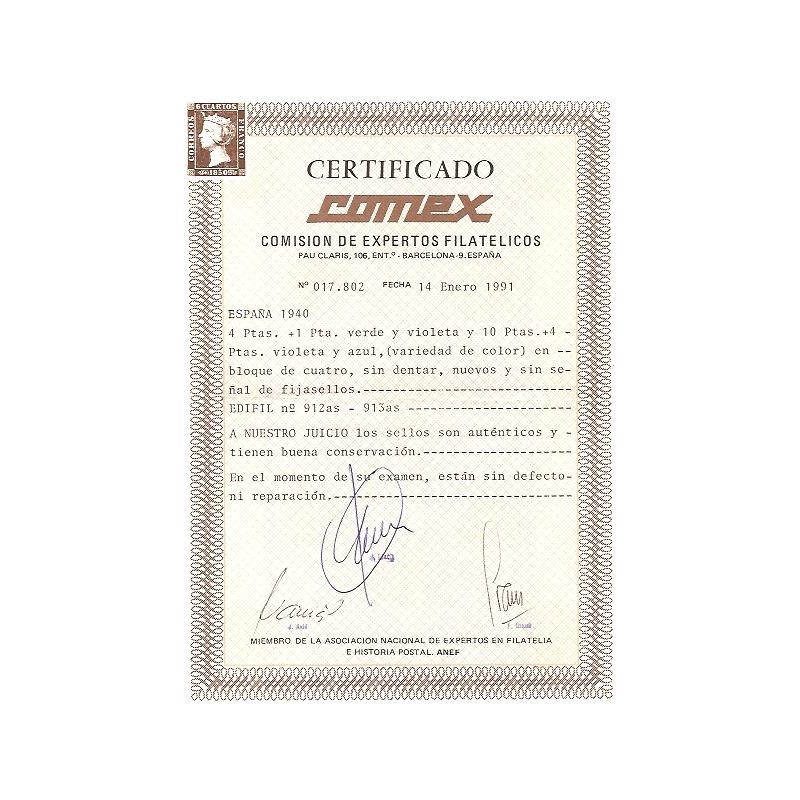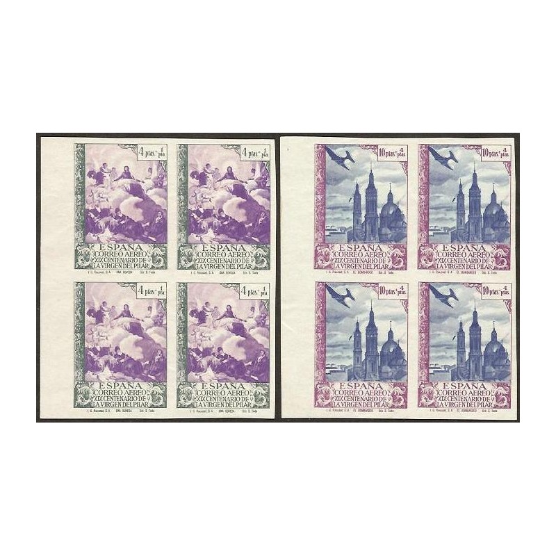 XIX Centenario de la venida de la Virgen del Pilar a Zaragoza. Correo aéreo. Rara serie completa de colores cambiados sin dentar en bloque de 4 con borde de hoja lateral presenta amplios márgenes. Tirada de 1.000 ejemplares. No catalogados sin señal de fijasellos. Lujo. Certificado Comex.