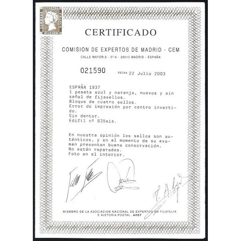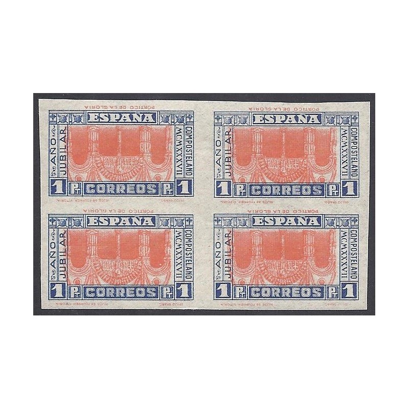 Año Jubilar Compostelano. Rarísimo error de impresión en bloque de 4 sin dentar con el centro invertido presenta amplios márgenes. Tirada de 50 ejemplares. Certificado C.E.M. Lujo.