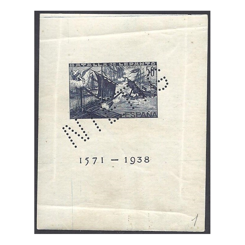 Batalla de Lepanto. Preciosa muestra sin dentar con cambio de color azul, taladro diagonal "NIETIG" y sin numeración. No catalogada.