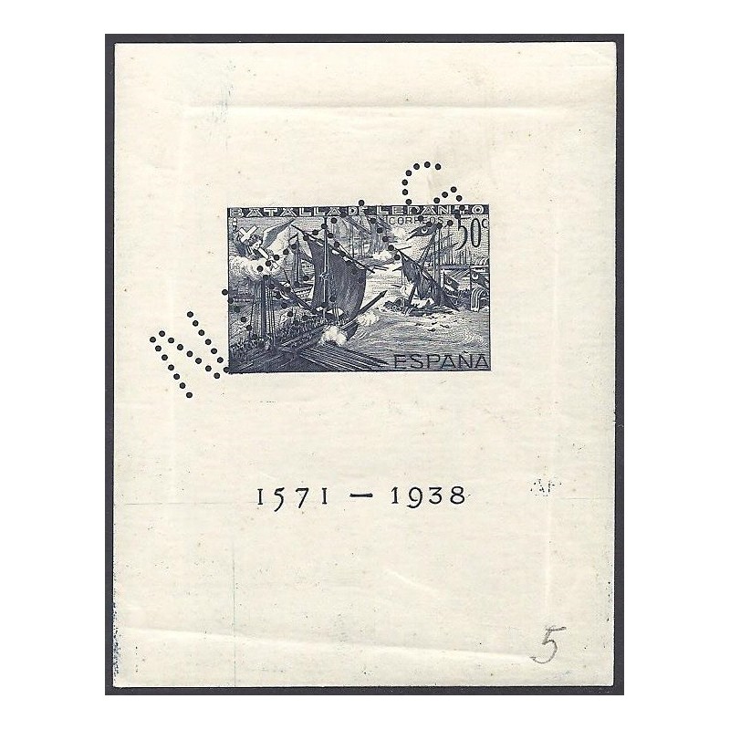 Batalla de Lepanto. Preciosa muestra sin dentar con cambio de color azul oscuro, taladro diagonal "NIETIG" y sin numeración. No catalogada.
