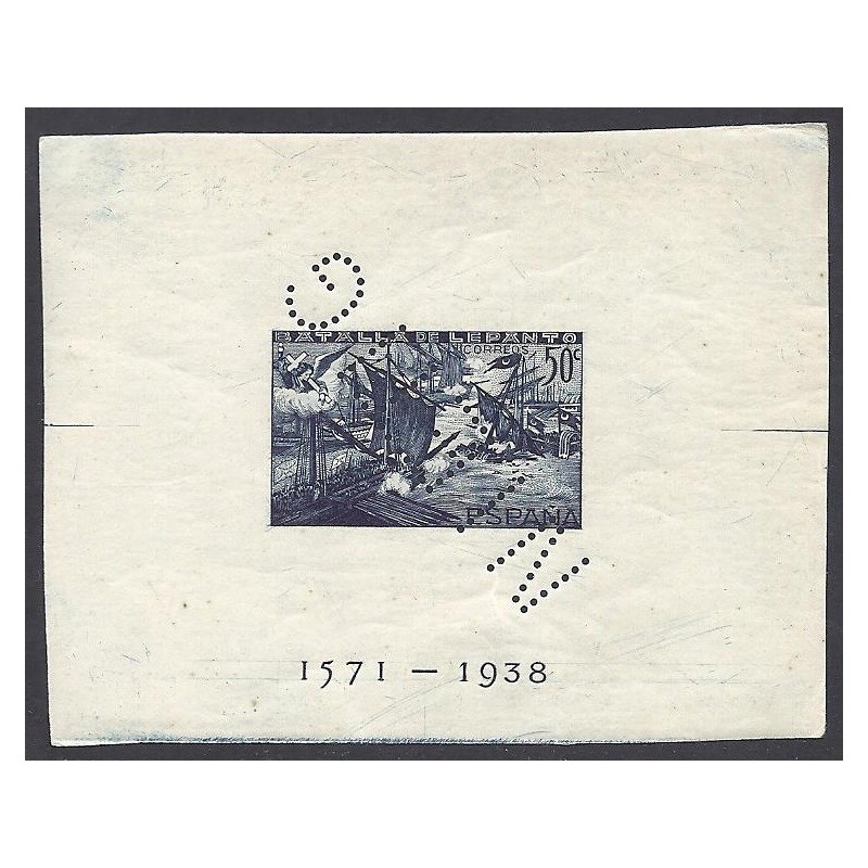 Batalla de Lepanto. Rarísima muestra sin dentar con cambio de color azul, taladro diagonal invertido "NIETIG" y sin numeración. No catalogada.
