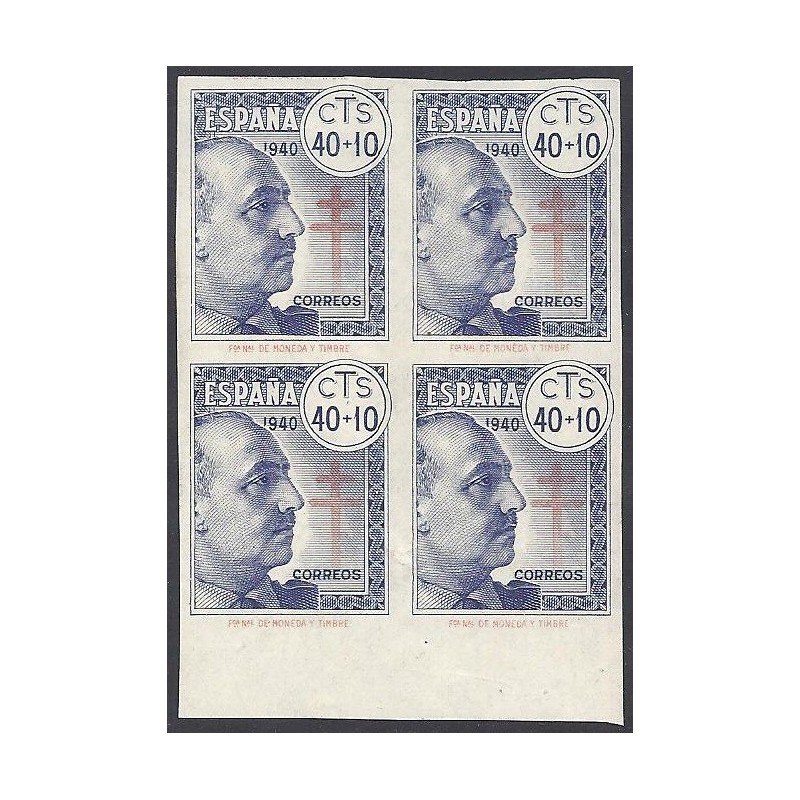 Pro Tuberculosos 1940. Precioso bloque de 4 sin dentar con error de reporte pie de imprenta "Fca Nal DE MONEDA Y TIMBRE" impreso en el mismo color que la cruz presenta borde de hoja inferior. No catalogado sin señal de fijasellos.