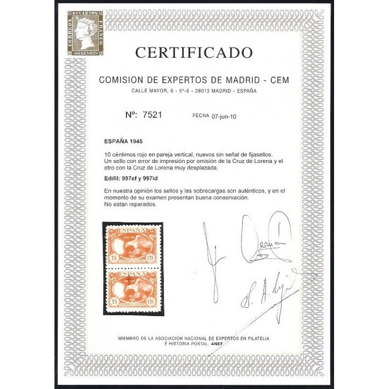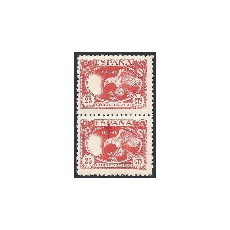 Pro Tuberculosos 1945. Correo aéreo. Rarísima pareja vertical con el valor superior con error de impresión por omisión de la Cruz de Lorena y el valor inferior con variedad de impresión Cruz de Lorena muy desplazada. Probable pieza única. Certificado C.E.M. Lujo.