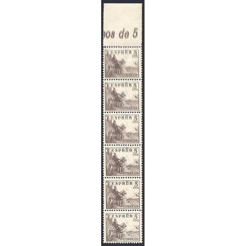 El Cid y General Franco. Preciosa tira de 6 con error de impresión duplicada en los primeros valores presenta borde de hoja superior. No catalogado sin señal de fijasellos.