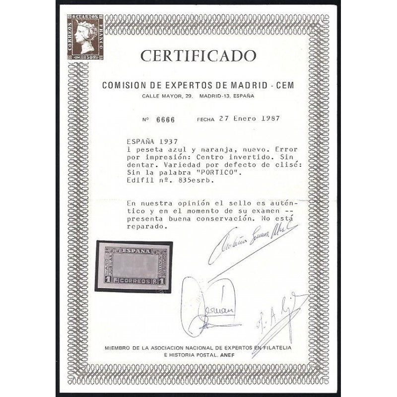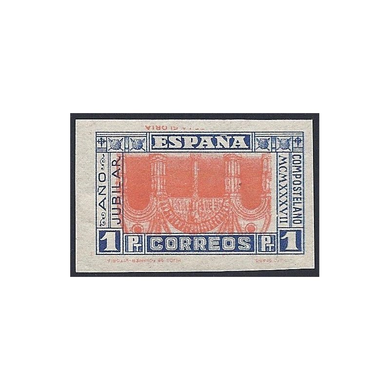 Año Jubilar Compostelano. Rarísimo error de impresión sin dentar con el centro invertido y variedad de reporte sin la palabra "PÓRTICO" presenta amplios márgenes. Sólo un par de piezas conocidas. Lujo. Certificado C.E.M.