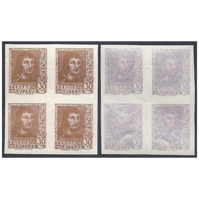 Fernando el Católico. Preciosos cambios de color en oro y plata sin dentar en bloques de 4 presentan amplios márgenes.