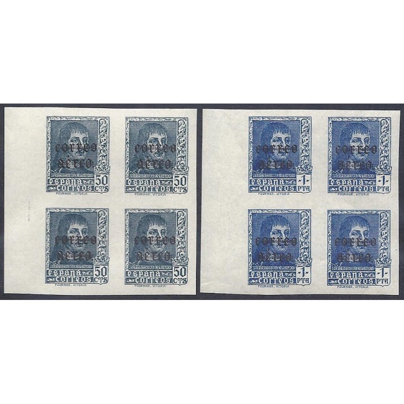 Fernando el Católico Correo aéreo. Muy rara serie completa sin dentar en bloque de 4 con la habilitación en color negro presenta amplios márgenes y borde de hoja lateral.