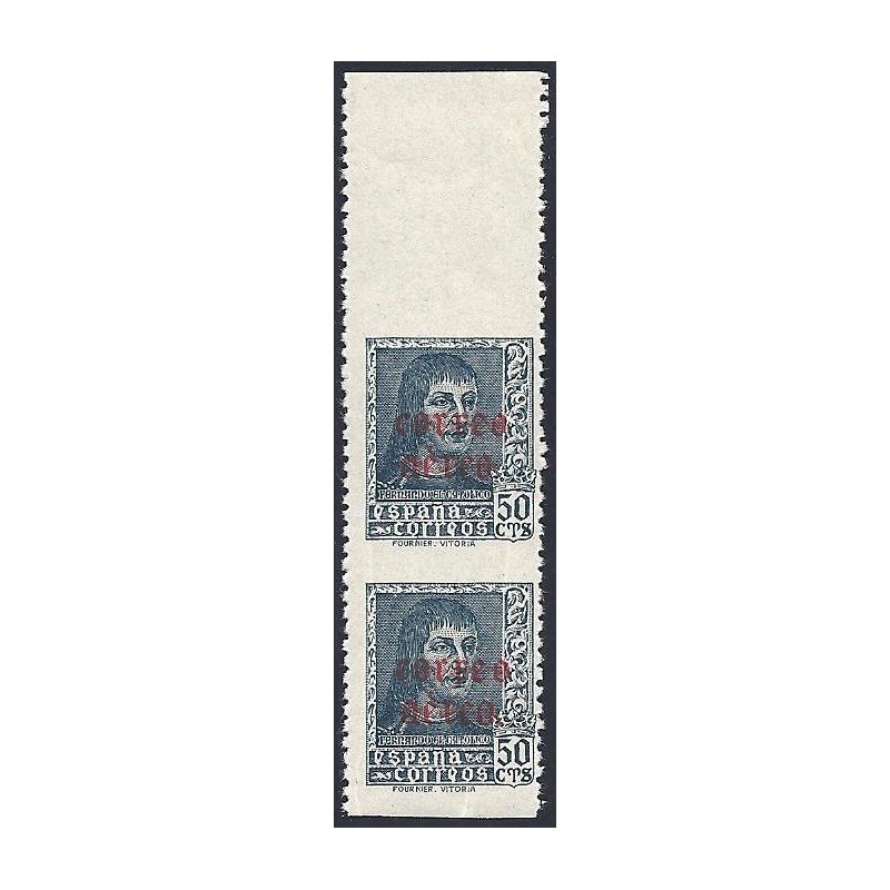 Fernando el Católico Correo aéreo. Preciosa pareja vertical con variedad de perforación sin dentado horizontal presenta borde de hoja superior. No catalogado.