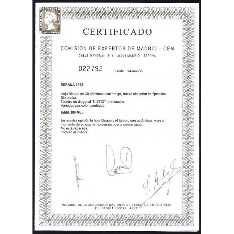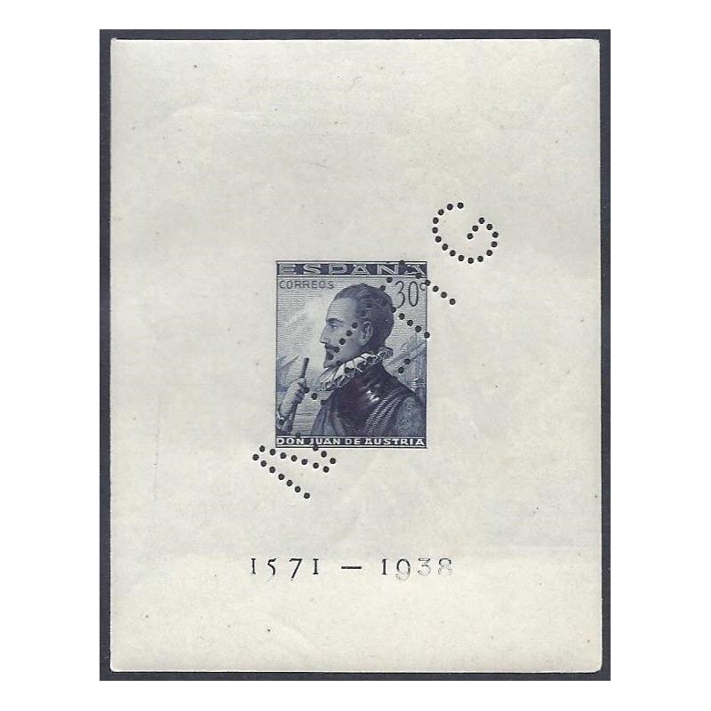 Batalla de Lepanto. Preciosa muestra sin dentar con cambio de color azul índigo, taladro diagonal "NIETIG" y sin numeración. No catalogada sin señal de fijasellos. Lujo. Certificado C.E.M.