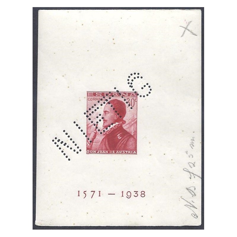 Batalla de Lepanto. Preciosa muestra sin dentar con cambio de color carmín, doble taladro diagonal "NIETIG" y sin numeración. No catalogada.