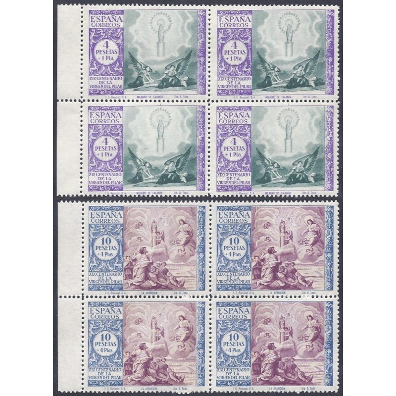 XIX Centenario de la venida de la Virgen del Pilar a Zaragoza. Preciosas variedades con colores cambiados en bloques de 4 presentan borde de hoja lateral. No catalogados sin señal de fijasellos. Tirada de 1.000 ejemplares de cada uno.