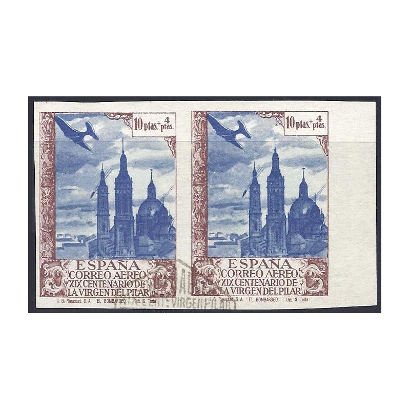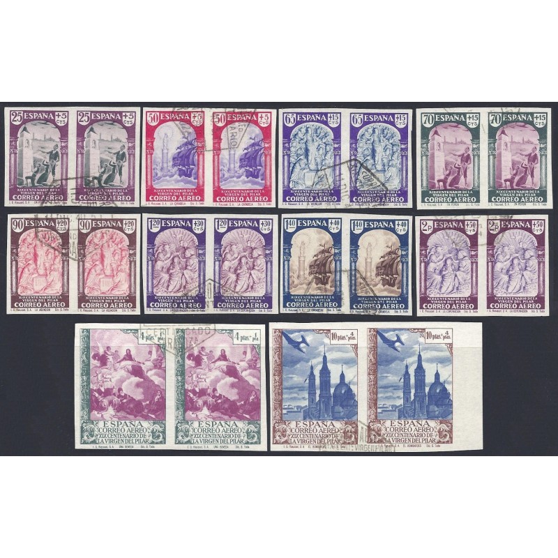 XIX Centenario de la venida de la Virgen del Pilar a Zaragoza. Correo aéreo. Rarísima serie completa sin dentar en parejas horizontales usada con matasellos de correo aéreo certificado de Zaragoza. Tirada de 1.000 ejemplares. No catalogada.