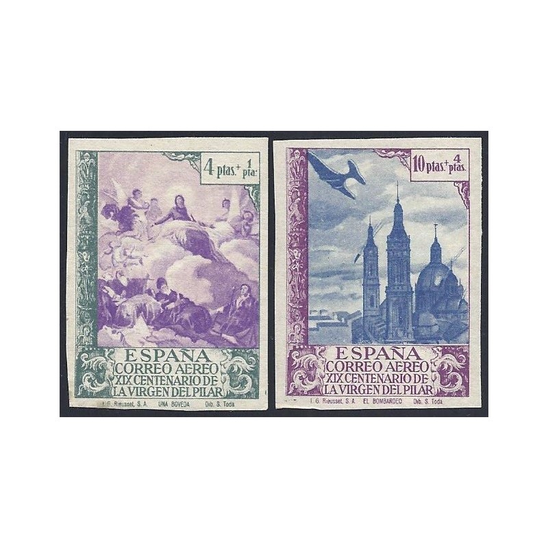 XIX Centenario de la venida de la Virgen del Pilar a Zaragoza. Correo aéreo. Preciosa serie completa de colores cambiados sin dentar presenta señal de fijasellos. Tirada de 1.000 ejemplares.