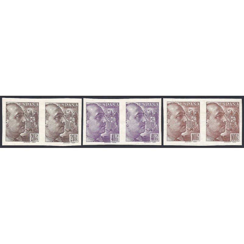 General Franco y escudo de España. Preciosa serie completa sin dentar en parejas horizontales presenta amplios márgenes. Rara.