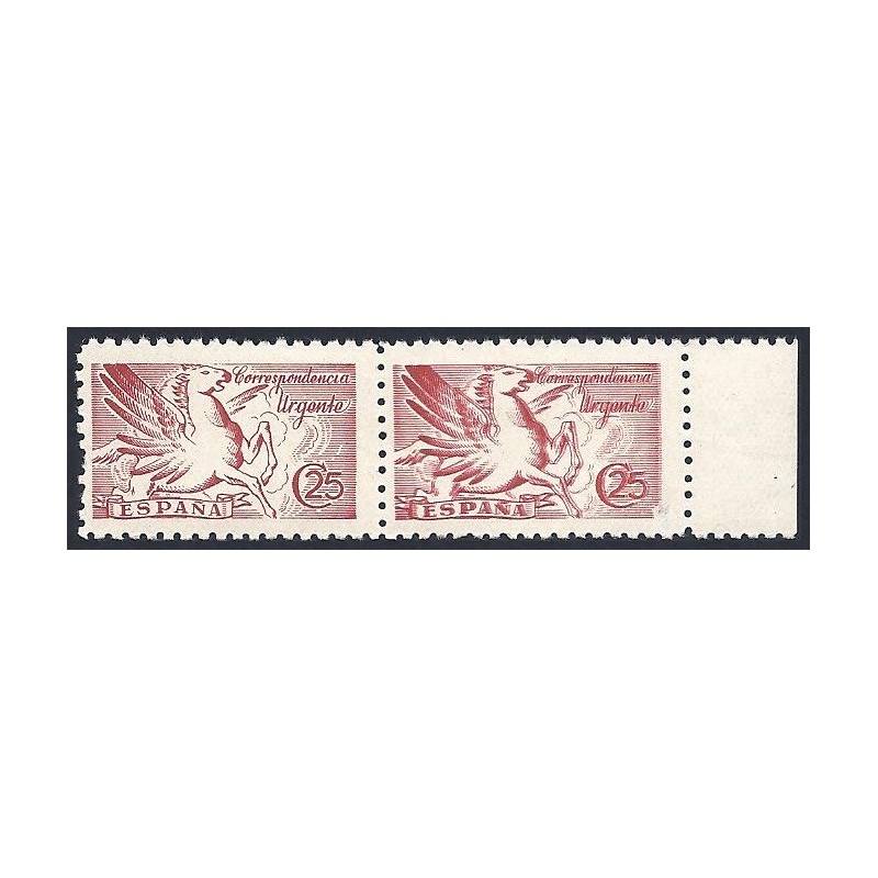 Pegaso. Bonita pareja horizontal con error por doble impresión en el segundo valor presenta borde de hoja lateral. No catalogado sin señal de fijasellos.