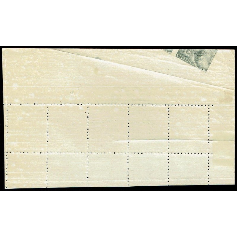 General Franco y escudo de España. Precioso bloque de 10 con el dentado horizontal desplazado y gran defecto de impresión en la esquina del pliego producido por un pliegue, encontrándose la parte que falta en el reverso del mismo. No catalogado. Pieza única.