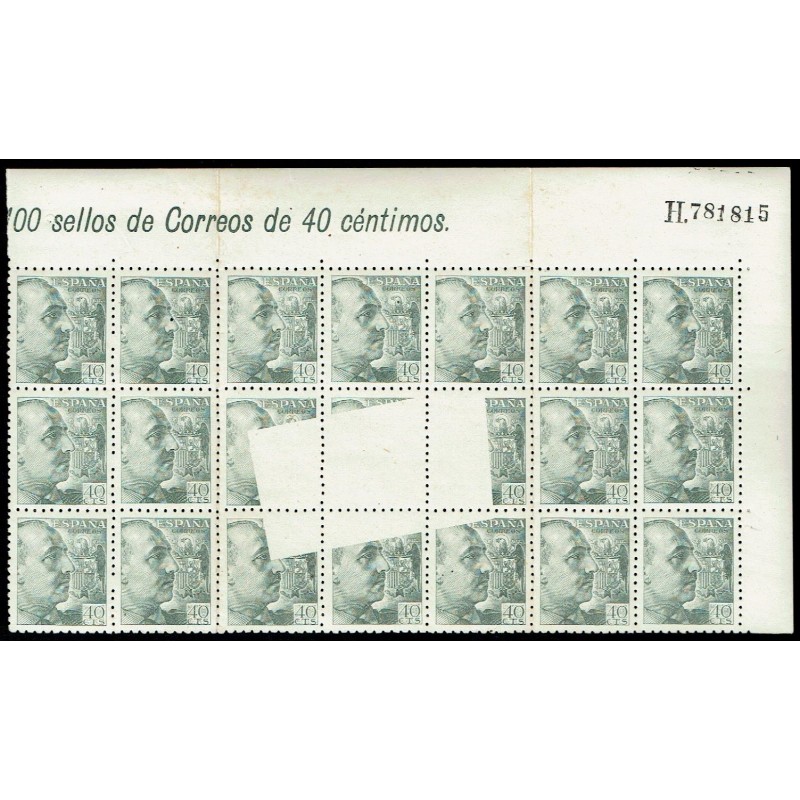 General Franco y escudo de España. Precioso bloque de 21 con gran defecto de impresión en los valores centrales presenta esquina de pliego superior con leyendas. No catalogado. Pieza única.