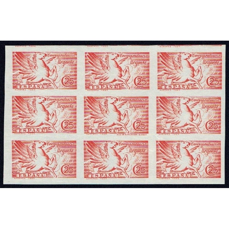Pegaso. Precioso bloque de 9 sellos sin dentar con el valor central variedad de reporte con pies "SANCHEZ TODA" e "HIJA DE B. FOURNIER-BURGOS", midiendo este último 14,5 mm presenta amplios márgenes. Raro.