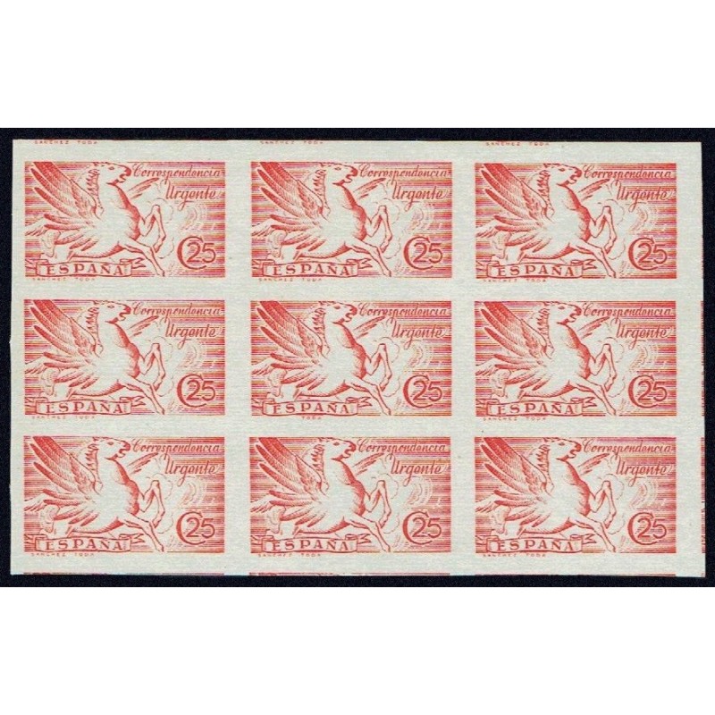 Pegaso. Precioso bloque de 9 sellos sin dentar con el valor central variedad de reporte con pie solamente "TODA" presenta amplios márgenes. Espectacular pieza de esta variedad no catalogada. Muy Raro.