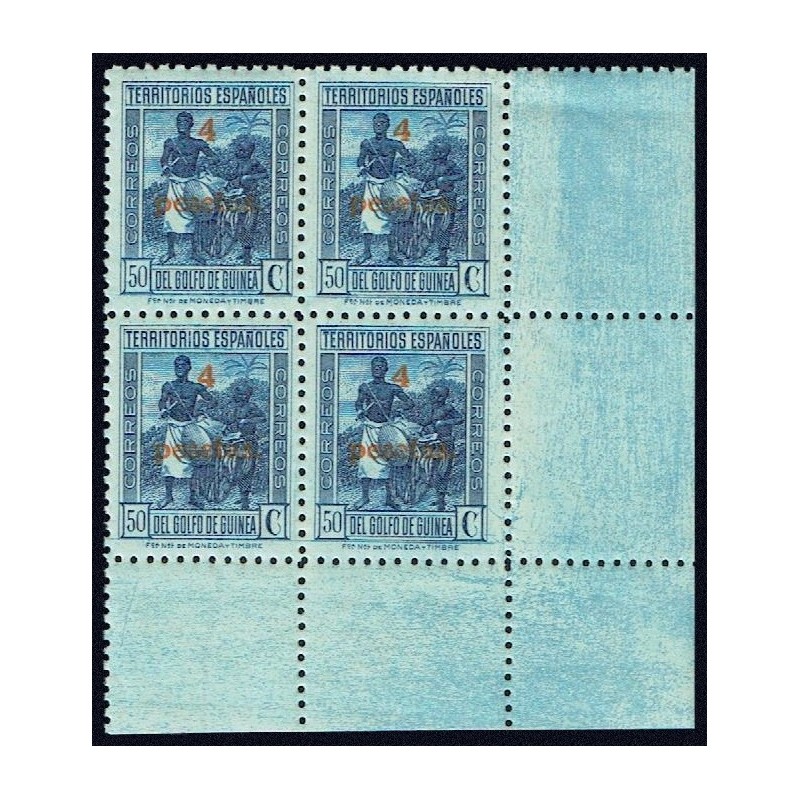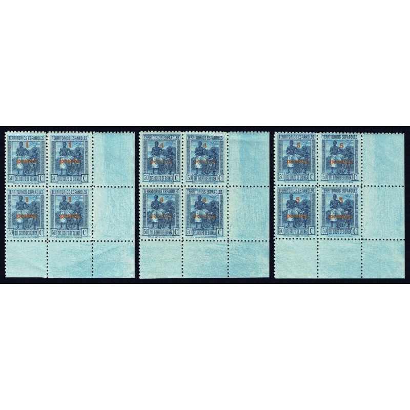 Tipo de 1931 habilitado. Músicos Kukumen de Misergue. Preciosa serie completa no expendida en bloque de 4 con esquinas de pliego. Lujo.