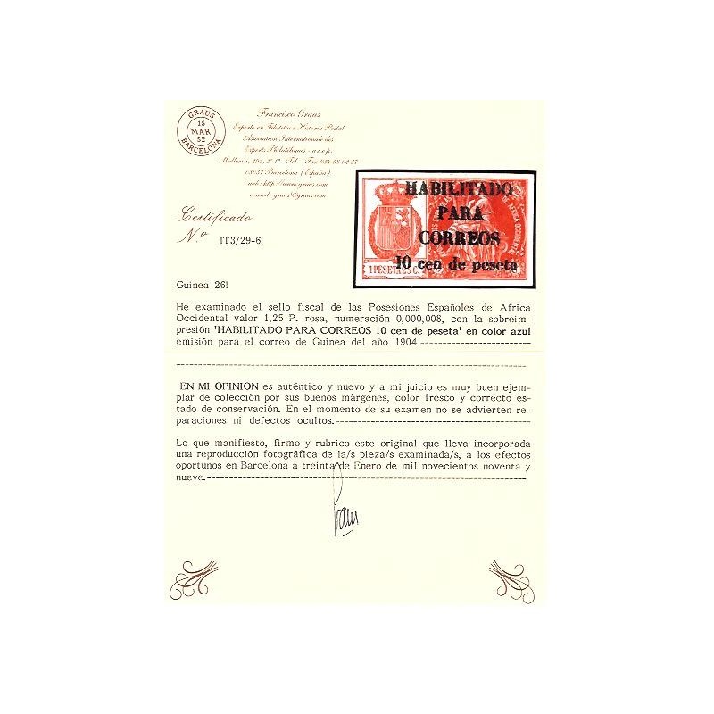 Pólizas habilitadas para Correos. Rarísimo ejemplar con habilitación azul presenta buenos márgenes. Lujo. Certificado Graus.