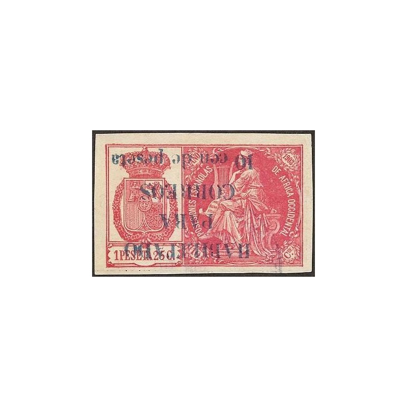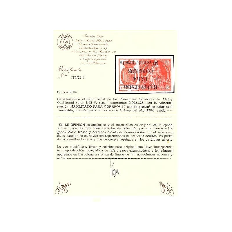Pólizas habilitadas para Correos. Rarísimo error de impresión usado con la habilitación azul invertida presenta amplios márgenes. No catalogado. Lujo. Certificado Graus.