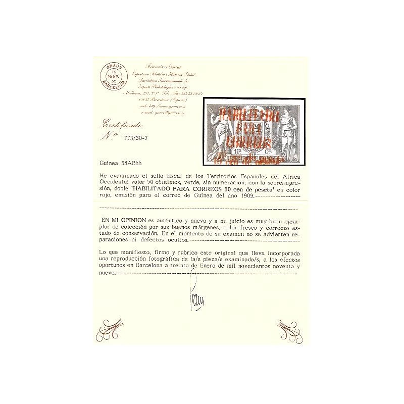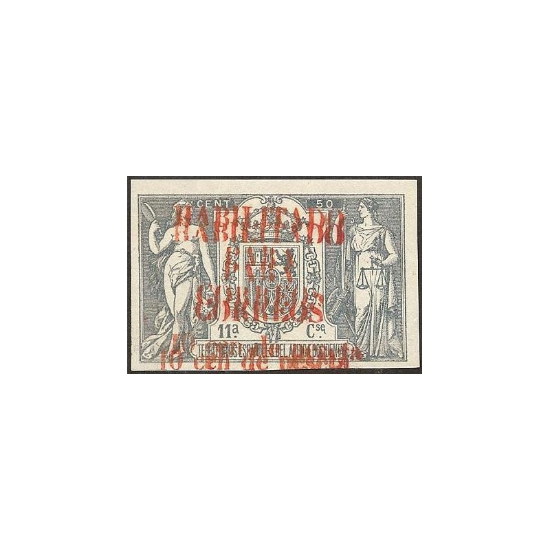 Sellos fiscales habilitados para Correos. Muy raro error de impresión con habilitación doble en color rojo presenta buenos márgenes. No catalogado. Certificado Graus.