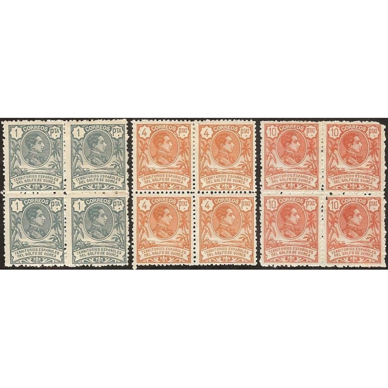 Alfonso XIII. Rara serie completa muestra en bloque de 4 con numeración A.000,000 presenta señal de fijasellos.